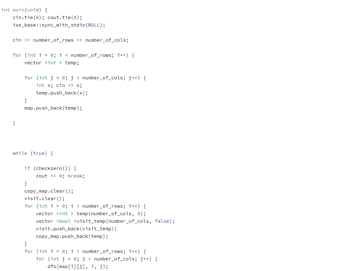 DFS로 덩어리의 수를 찾으면서 두 덩어리 이상이 되는 시점을 찾는다.