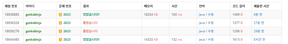 첫째 줄에는 가수의 수 N과 보조 PD의 수 M이 주어진다. 가수는 번호 1, 2,…,N 으로 표시한다. 둘째 줄부터 각 보조 PD가 정한 순서들이 한 줄에 하나씩 나온다. 각 줄의 맨 앞에는 보조 PD가 담당한 가수의 수가 나오고, 그 뒤로는 그 가수들의 순서가 나온다. N은 1이상 1,000이하의 정수이고, M은 1이상 100이하의 정수이다.