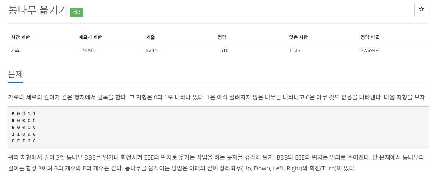 시뮬 + BFS문제이다. 통나무가 특정위치에 왔을때 방문체크를 해주기 위하여 3차원 VISIT 배열을 사용한다.