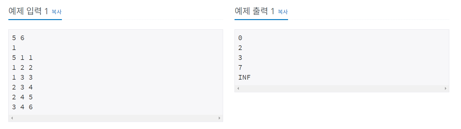 첫째 줄에 정점의 개수 V와 간선의 개수 E가 주어진다. (1≤V≤20,000, 1≤E≤300,000) 모든 정점에는 1부터 V까지 번호가 매겨져 있다고 가정한다. 둘째 줄에는 시작 정점의 번호 K(1≤K≤V)가 주어진다. 셋째 줄부터 E개의 줄에 걸쳐 각 간선을 나타내는 세 개의 정수 (u, v, w)가 순서대로 주어진다. 이는 u에서 v로 가는 가중치 w인 간선이 존재한다는 뜻이다. u와 v는 서로 다르며 w는 10 이하의 자연수이다. 서로 다른 두