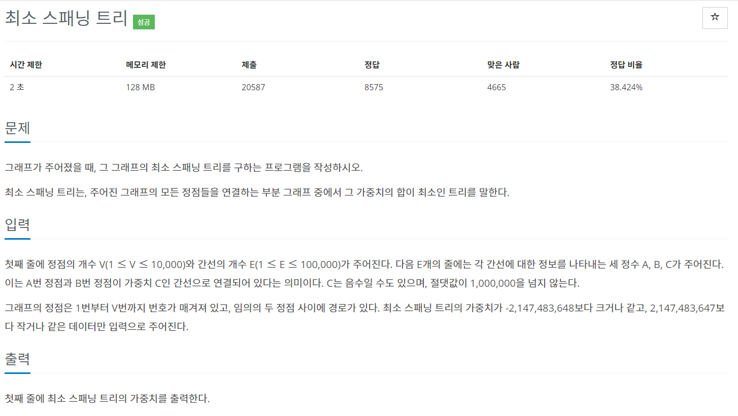 첫째 줄에 정점의 개수 V(1 ≤ V ≤ 10,000)와 간선의 개수 E(1 ≤ E ≤ 100,000)가 주어진다. 다음 E개의 줄에는 각 간선에 대한 정보를 나타내는 세 정수 A, B, C가 주어진다. 이는 A번 정점과 B번 정점이 가중치 C인 간선으로 연결되어 있다는 의미이다. C는 음수일 수도 있으며, 절댓값이 1,000,000을 넘지 않는다. 그래프의 정점은 1번부터 V번까지 번호가 매겨져 있고, 임의의 두 정점 사이에 경로가 있다. 최소 스패닝