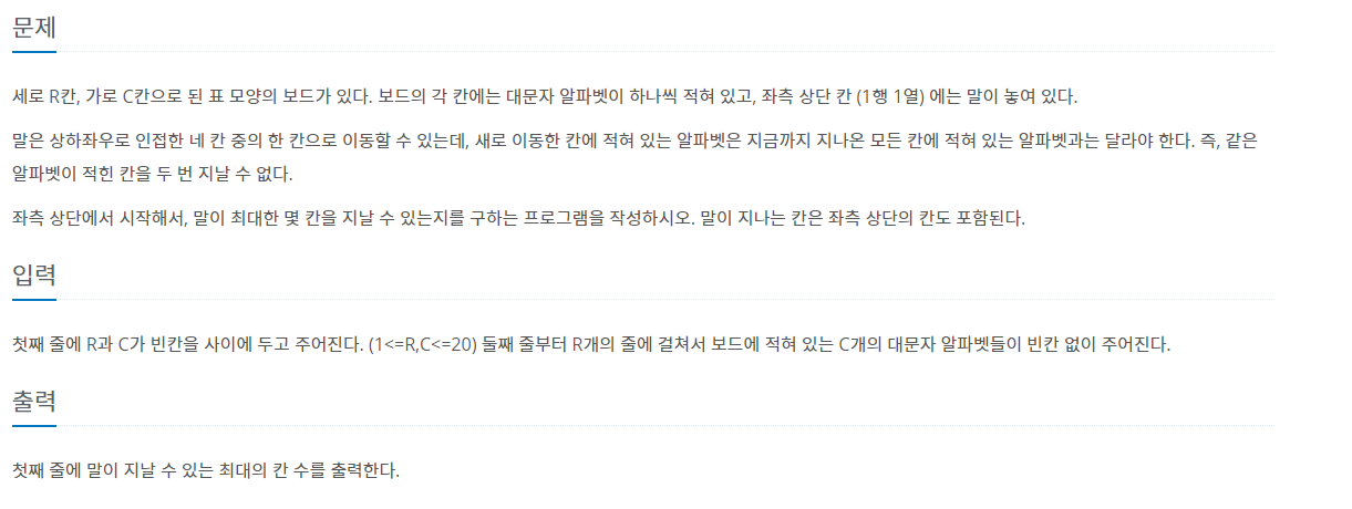 좌측상단에서 시작하여서 가본적이 없는 알파벳을 찾아서 상하좌우로 진행하였을때에, 최장거리를 출력하는 문제이다.