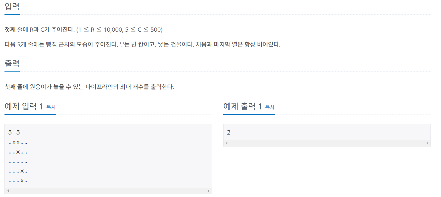 문제 유명한 제빵사 김원웅은 빵집을 운영하고 있다. 원웅이의 빵집은 글로벌 재정 위기를 피해가지 못했고, 결국 심각한 재정 위기에 빠졌다. 원웅이는 지출을 줄이고자 여기저기 지출을 살펴보던 중에, 가스비가 제일 크다는 것을 알게되었다. 따라서 원웅이는 근처 빵집의 가스관에 몰래 파이프를 설치해 훔쳐서 사용하기로 했다. 빵집이 있는 곳은 R*C 격자로 표현할 수 있다. 첫째 열은 근처 빵집의 가스관이고, 마지막 열은 원웅이의 빵집이다. 원웅이는 가스관과 빵