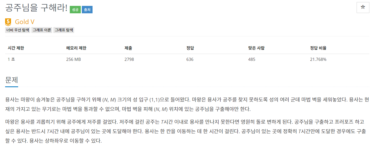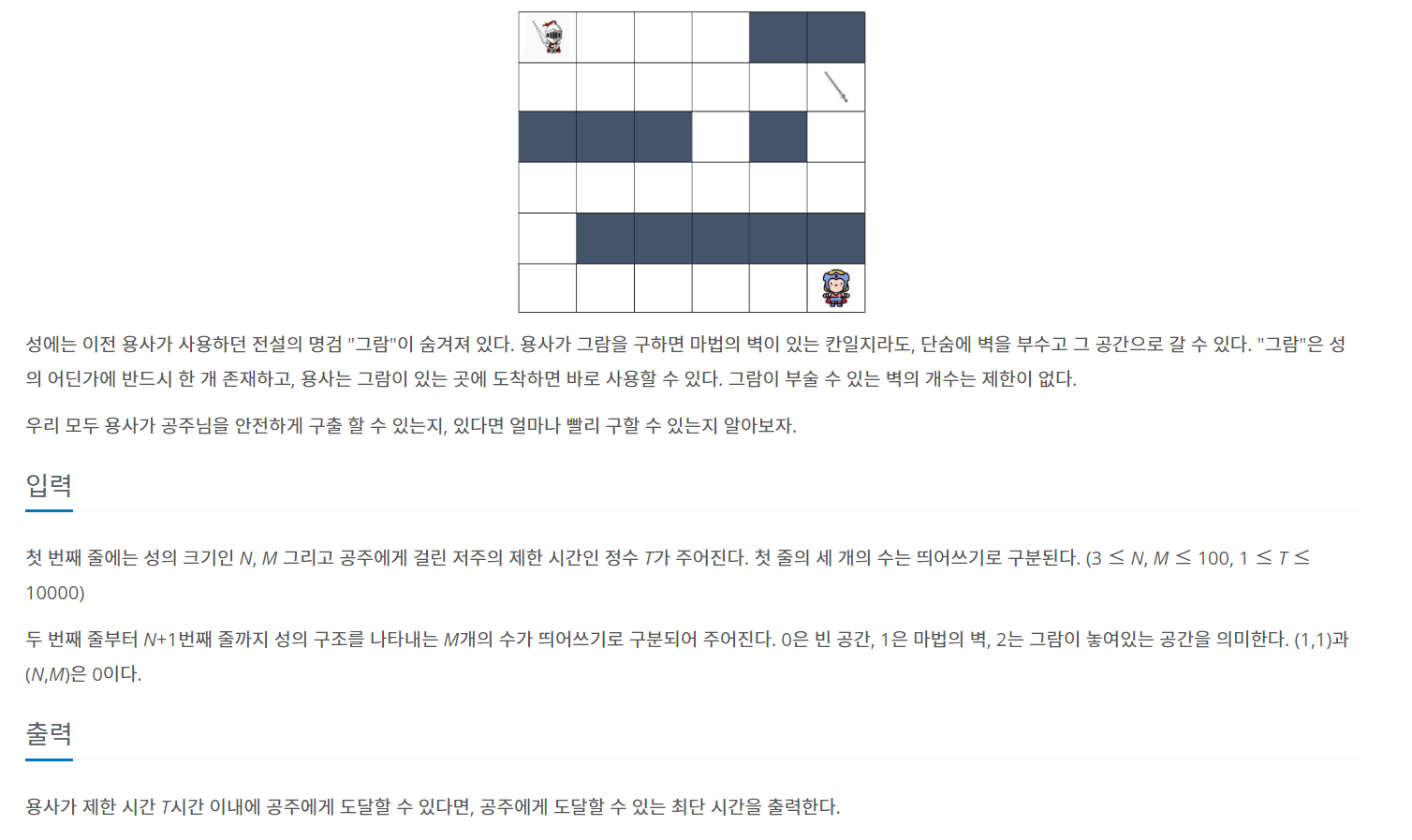 용사는 마왕이 숨겨놓은 공주님을 구하기 위해 (N, M) 크기의 성 입구 (1,1)으로 들어왔다. 마왕은 용사가 공주를 찾지 못하도록 성의 여러 군데 마법 벽을 세워놓았다. 용사는 현재의 가지고 있는 무기로는 마법 벽을 통과할 수 없으며, 마법 벽을 피해 (N, M) 위치에 있는 공주님을 구출해야만 한다. 마왕은 용사를 괴롭히기 위해 공주에게 저주를 걸었다. 저주에 걸린 공주는 T시간 이내로 용사를 만나지 못한다면 영원히 돌로 변하게 된다. 공주님을 구출