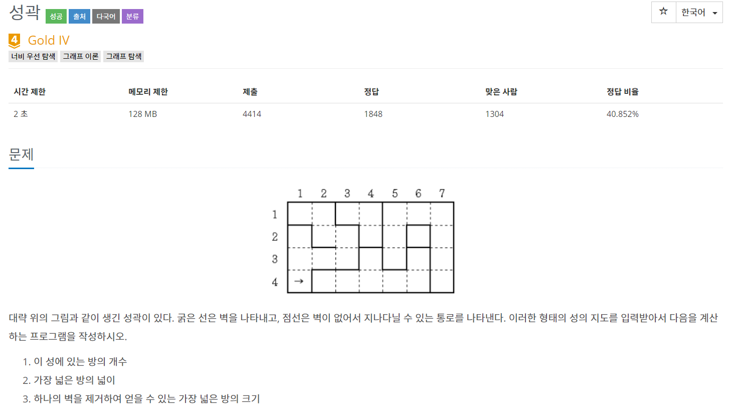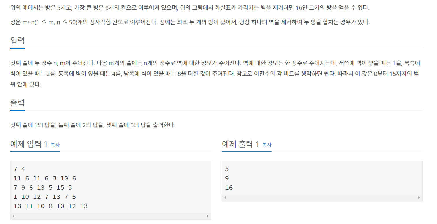 주어진 맵에서 성곽의 크기를 구하면서 벽하나를 제거해서 합친 면적중 가장 큰 값을 찾는 문제이다.