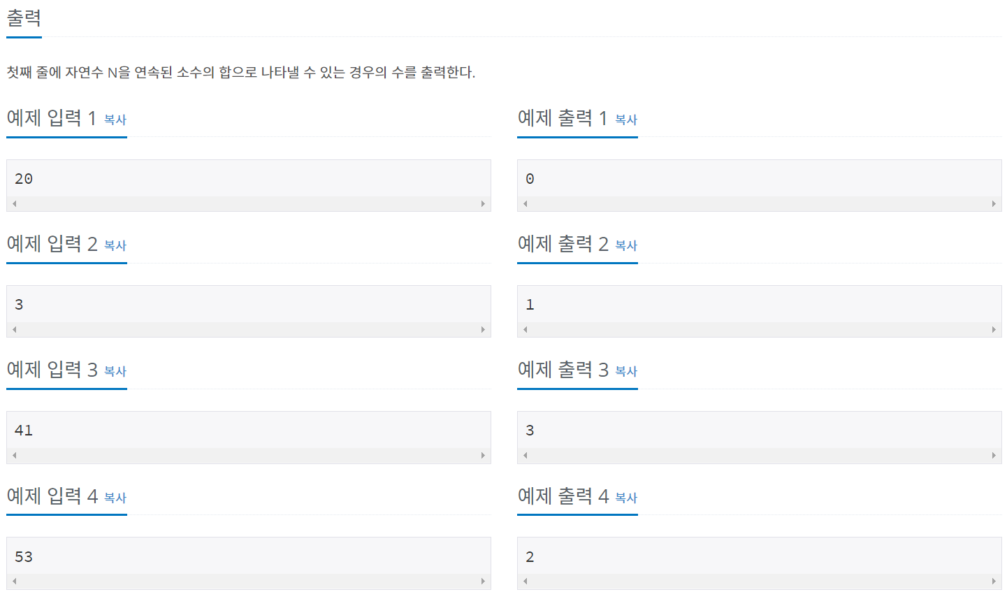 문제 하나 이상의 연속된 소수의 합으로 나타낼 수 있는 자연수들이 있다. 몇 가지 자연수의 예를 들어 보면 다음과 같다. 3 : 3 (한 가지) 41 : 2+3+5+7+11+13 = 11+13+17 = 41 (세 가지) 53 : 5+7+11+13+17 = 53 (두 가지) 하지만 연속된 소수의 합으로 나타낼 수 없는 자연수들도 있는데, 20이 그 예이다. 7+13을 계산하면 20이 되기는 하나 7과 13이 연속이 아니기에 적합한 표현이 아니다. 또한 한
