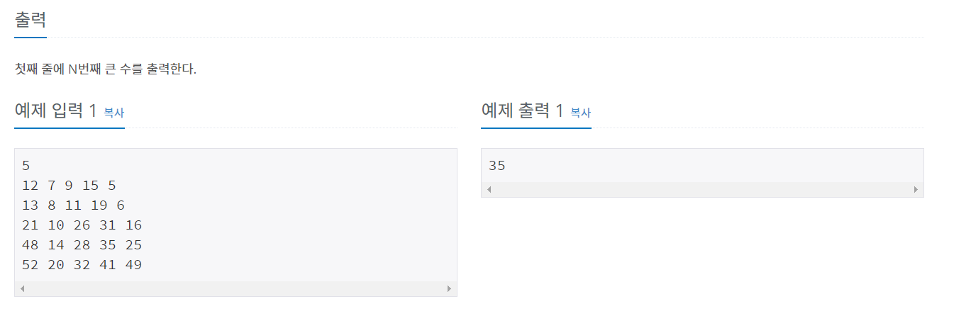 N번째 큰수를 구하기위해서 N^2의 배열을 선언한다 메모리제한이 12mb이므로