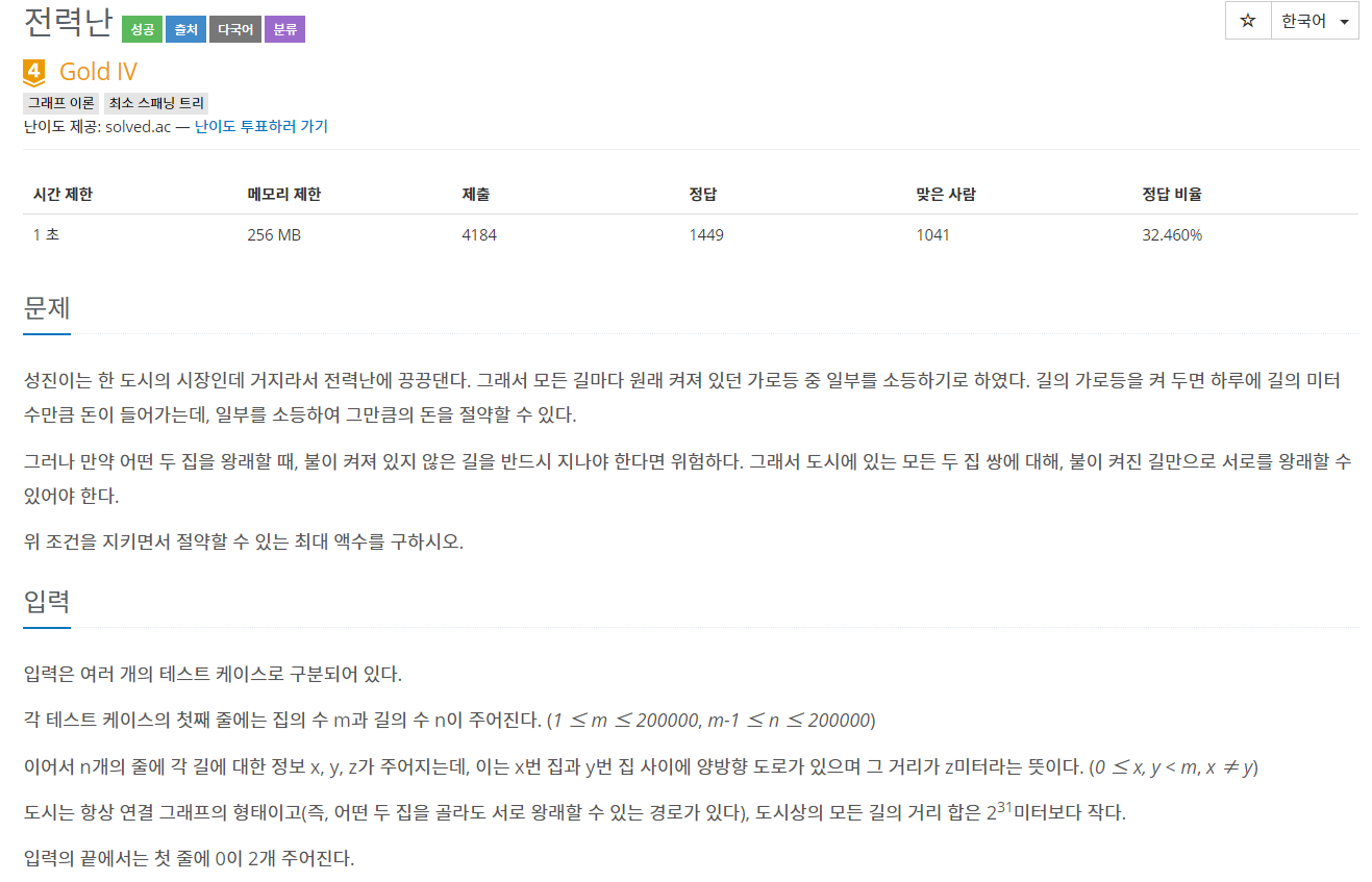 문제 성진이는 한 도시의 시장인데 거지라서 전력난에 끙끙댄다. 그래서 모든 길마다 원래 켜져 있던 가로등 중 일부를 소등하기로 하였다. 길의 가로등을 켜 두면 하루에 길의 미터 수만큼 돈��