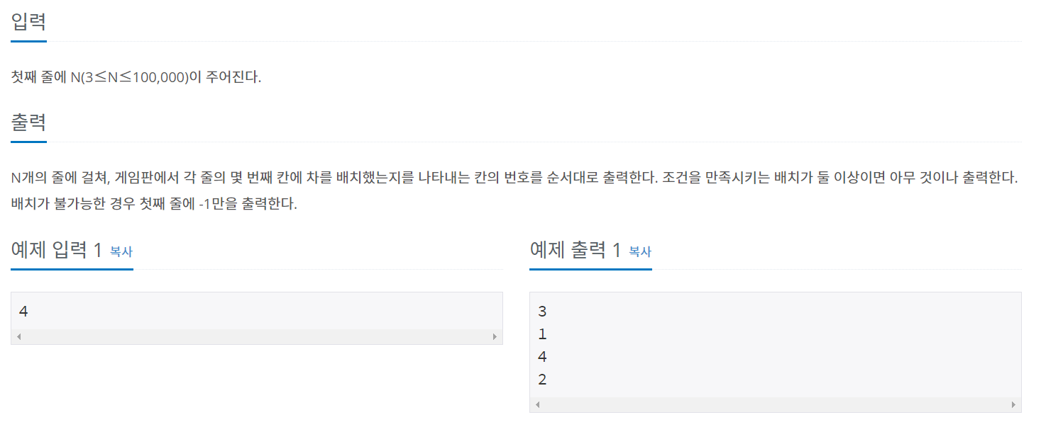N개의 줄에 걸쳐, 게임판에서 각 줄의 몇 번째 칸에 차를 배치했는지를 나타내는 칸의 번호를 순서대로 출력한다. 조건을 만족시키는 배치가 둘 이상이면 아무 것이나 출력한다. 배치가 불가능��