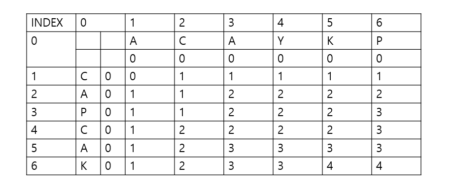 최장 공통 부분 수열을 구하기 위해 이전까지의 최장 공통 부분 수열을 구해 놓는다.