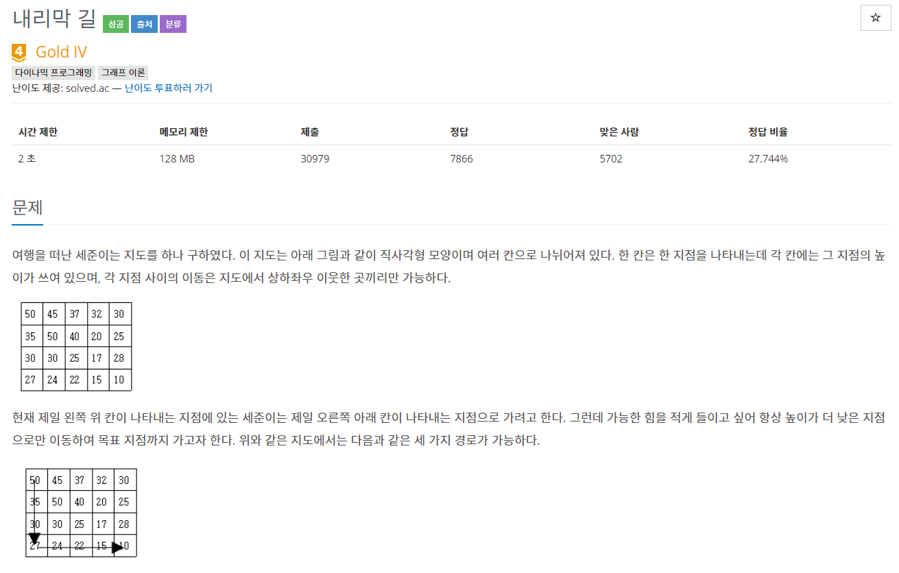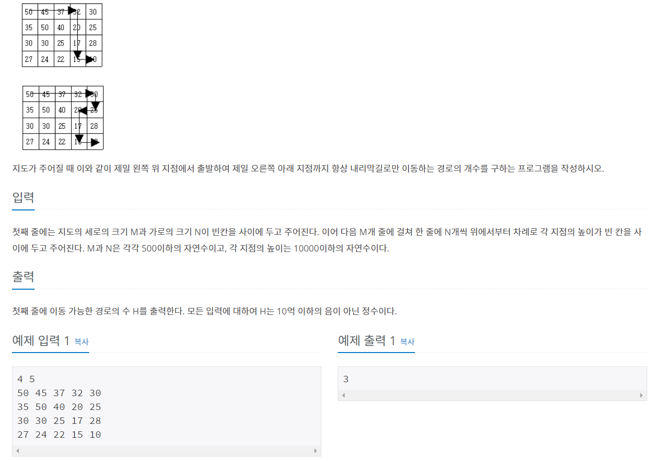 여행을 떠난 세준이는 지도를 하나 구하였다. 이 지도는 아래 그림과 같이 직사각형 모양이며 여러 칸으로 나뉘어져 있다. 한 칸은 한 지점을 나타내는데 각 칸에는 그 지점의 높이가 쓰여 있으�