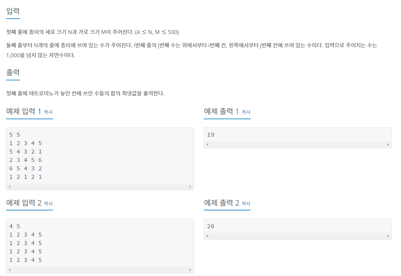 폴리오미노란 크기가 1×1인 정사각형을 여러 개 이어서 붙인 도형이며, 다음과 같은 조건을 만족해야 한다. 정사각형은 서로 겹치면 안 된다. 도형은 모두 연결되어 있어야 한다. 정사각형의 변�