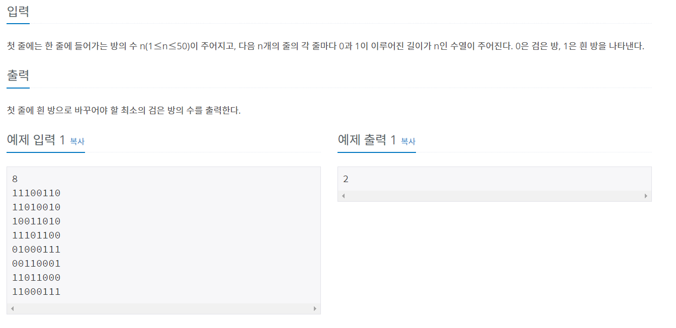 첫 줄에는 한 줄에 들어가는 방의 수 n(1≤n≤50)이 주어지고, 다음 n개의 줄의 각 줄마다 0과 1이 이루어진 길이가 n인 수열이 주어진다. 0은 검은 방, 1은 흰 방을 나타낸다.