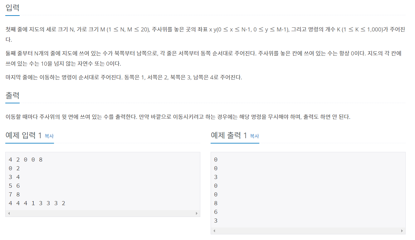 첫째 줄에 지도의 세로 크기 N, 가로 크기 M (1 ≤ N, M ≤ 20), 주사위를 놓은 곳의 좌표 x y(0 ≤ x ≤ N-1, 0 ≤ y ≤ M-1), 그리고 명령의 개수 K (1 ≤ K ≤ 1,000)가 주어진다. 둘째 줄부터 N개의 줄에 지도
