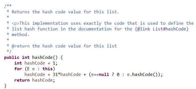 범위기반으로 리스트를 돌면서 내부의 Wrapper Class의 해쉬코드값을 적절하게 연산을 통하여 하나의 정수값을 반환하는 것을 알수있다!