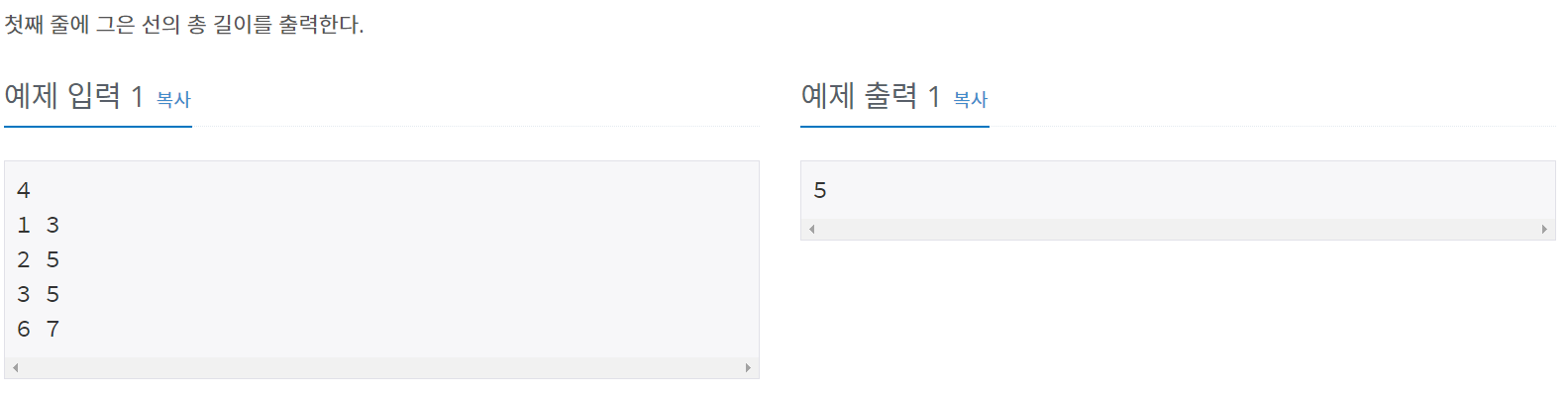 첫째 줄에 선을 그은 횟수 N(1 ≤ N ≤ 1,000,000)이 주어진다. 다음 N개의 줄에는 선을 그을 때 선택한 두 점의 위치 x, y(-1,000,000,000 ≤ x < y ≤ 1,000,000,000)가 주어진다.