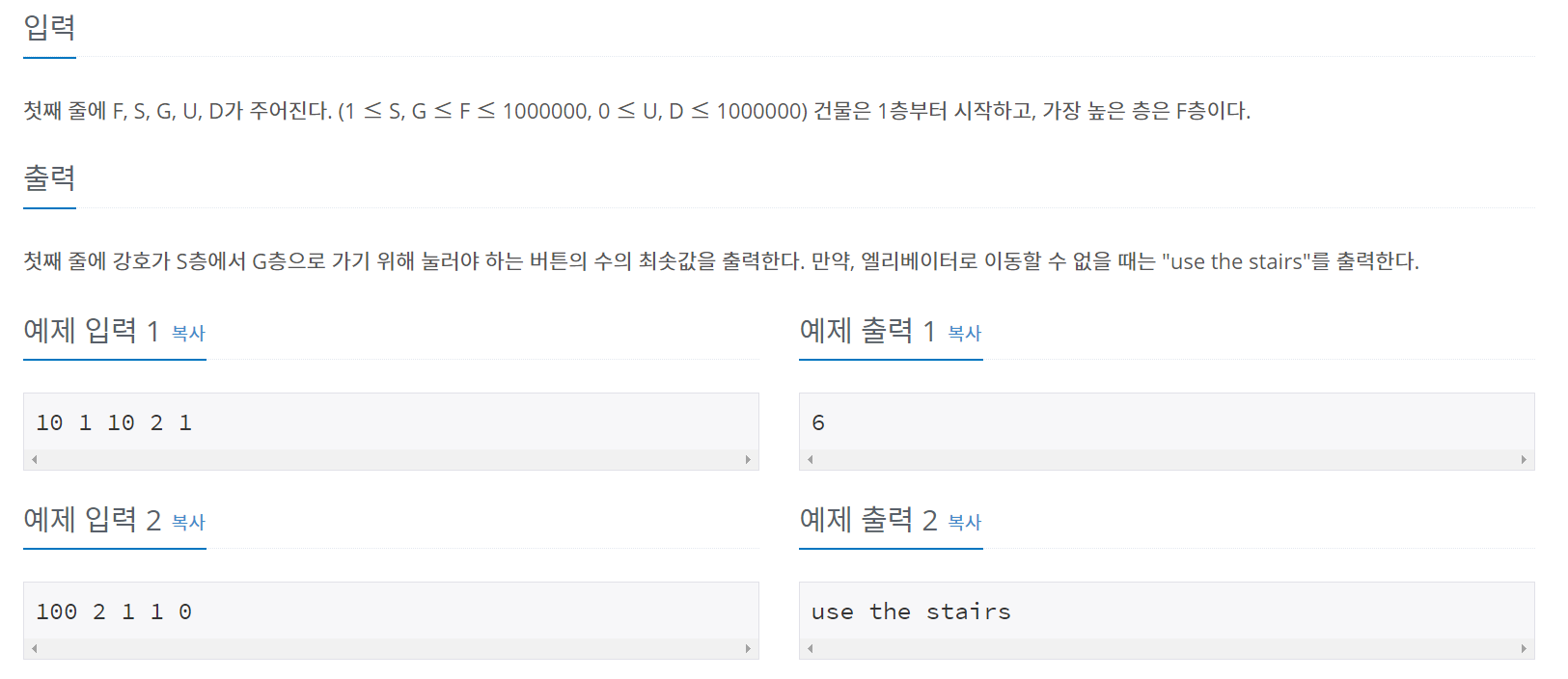 첫째 줄에 F, S, G, U, D가 주어진다. (1 ≤ S, G ≤ F ≤ 1000000, 0 ≤ U, D ≤ 1000000) 건물은 1층부터 시작하고, 가장 높은 층은 F층이다.