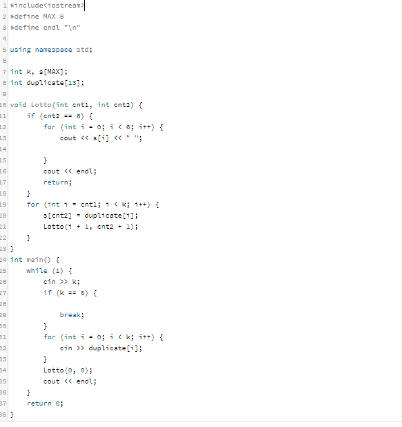 재귀함수를 통하여 해결할 수 있는 문제이다. 수를 입력받는 행렬을 선언하여 뽑을 수 있는 수를 입력 받고, 재귀 함수를 통하여 독일 로또의 출력 숫자인 6개로 출력 행렬이 채워지면 출력한다.