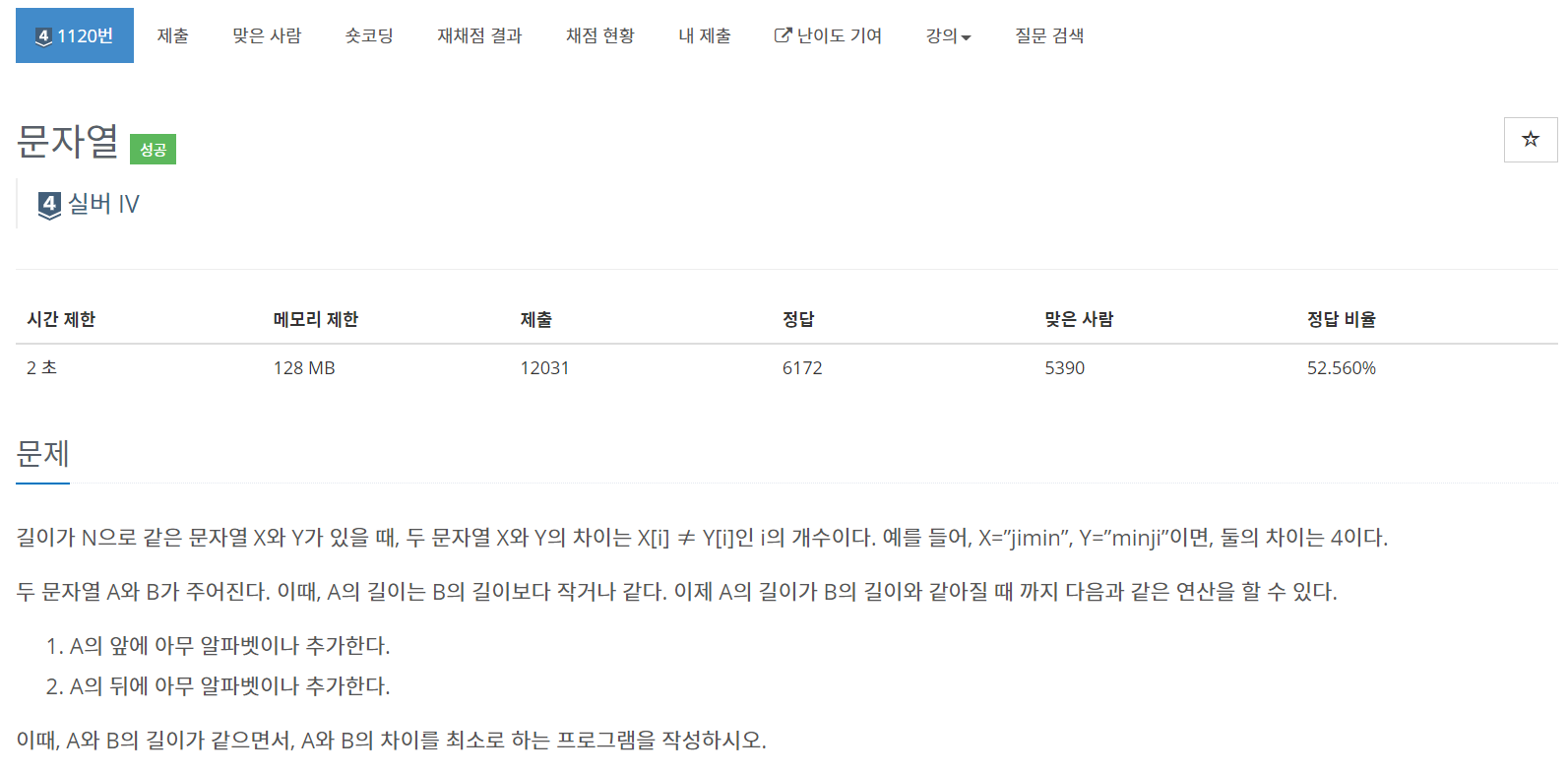 길이가 N으로 같은 문자열 X와 Y가 있을 때, 두 문자열 X와 Y의 차이는 X[i] ≠ Y[i]인 i의 개수이다. 예를 들어, X=”jimin”, Y=”minji”이면, 둘의 차이는 4이다. 두 문자열 A와 B가 주어진다. 이때, A의