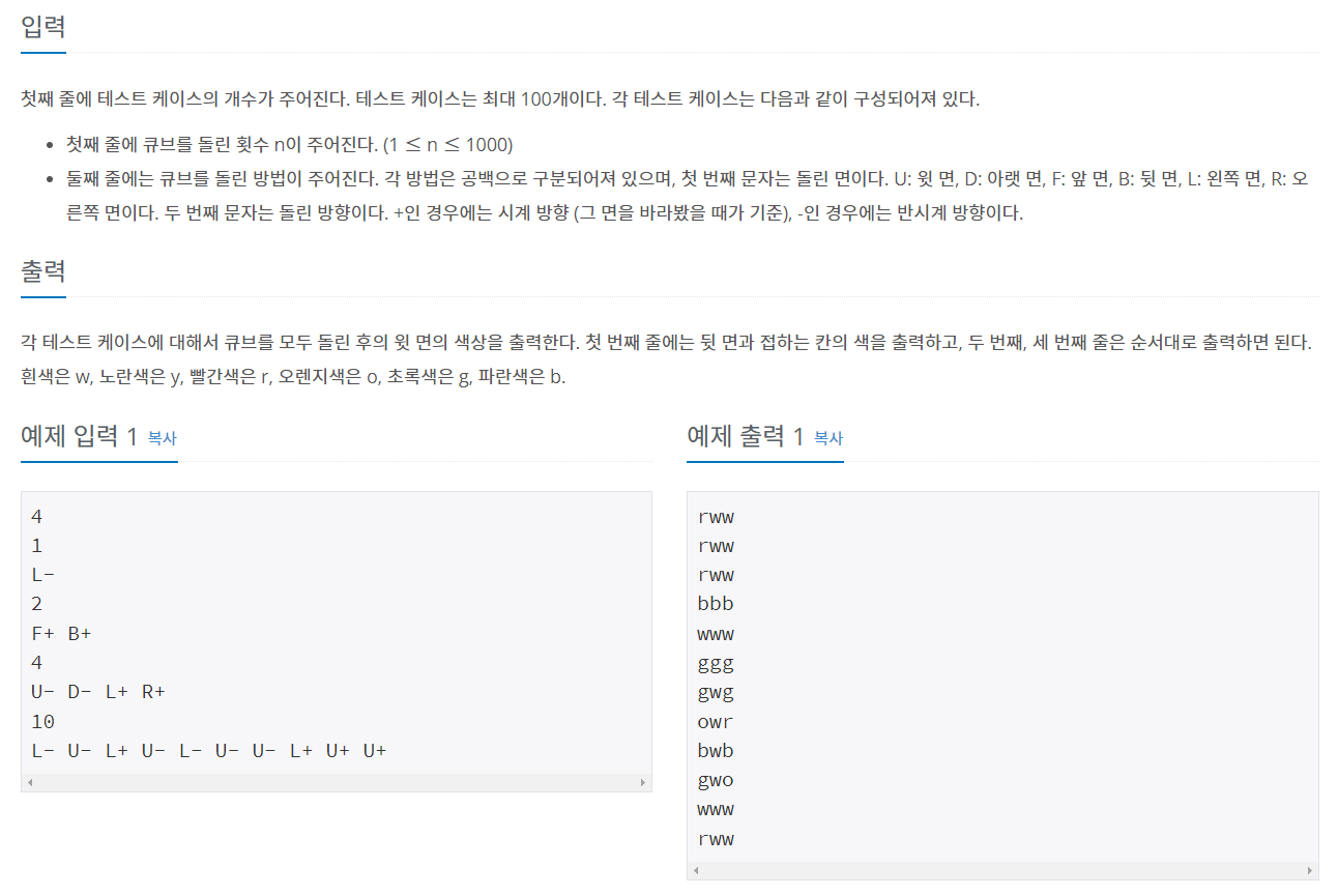 각 테스트 케이스에 대해서 큐브를 모두 돌린 후의 윗 면의 색상을 출력한다. 첫 번째 줄에는 뒷 면과 접하는 칸의 색을 출력하고, 두 번째, 세 번째 줄은 순서대로 출력하면 된다. 흰색은 w, 노란