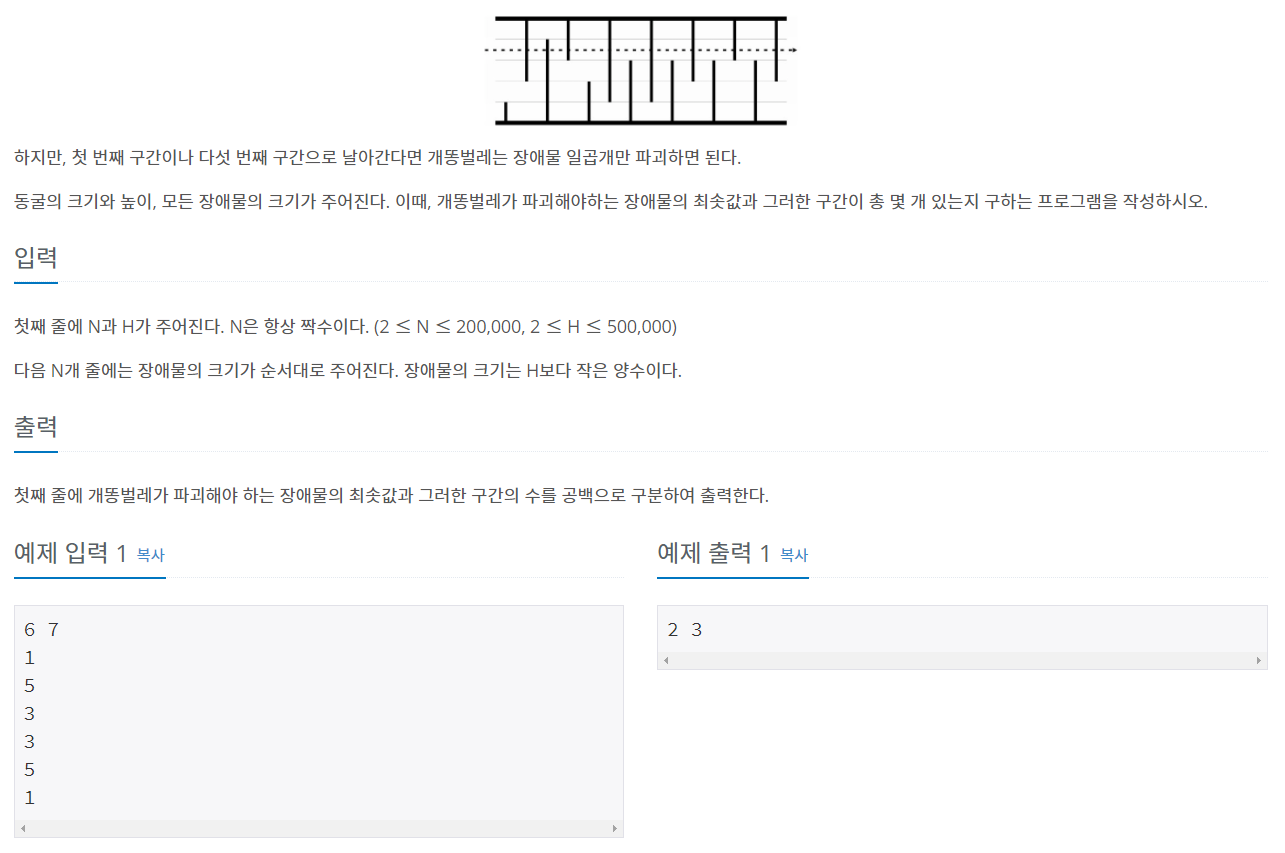 개똥벌레 한 마리가 장애물(석순과 종유석)로 가득찬 동굴에 들어갔다. 동굴의 길이는 N미터이고, 높이는 H미터이다. (N은 짝수) 첫 번째 장애물은 항상 석순이고, 그 다음에는 종유석과 석순이