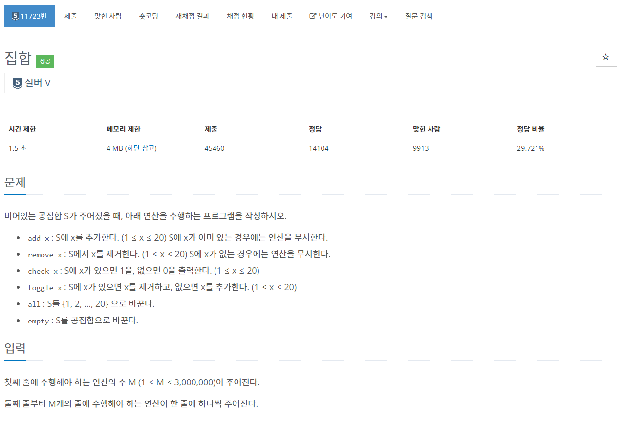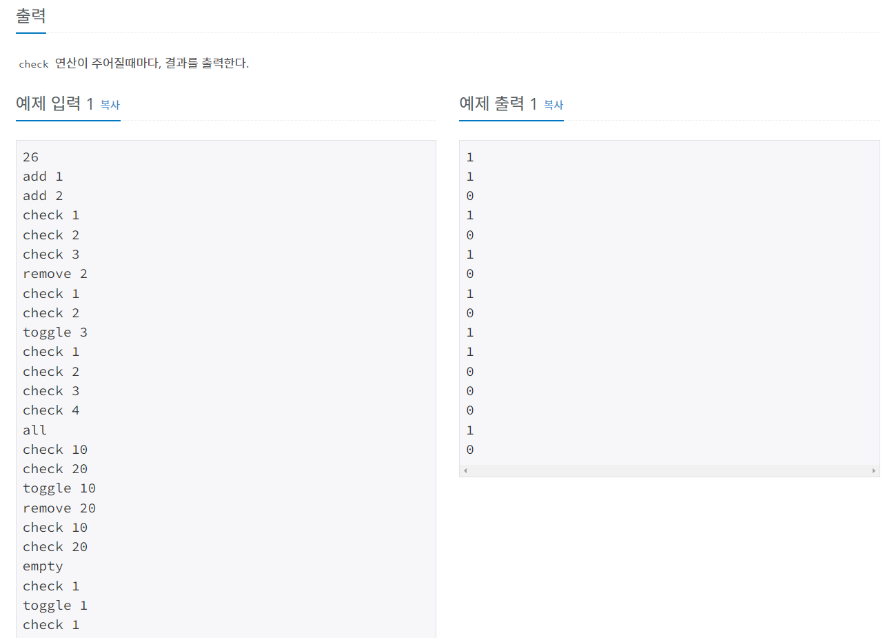 첫째 줄에 수행해야 하는 연산의 수 M (1 ≤ M ≤ 3,000,000)이 주어진다. 둘째 줄부터 M개의 줄에 수행해야 하는 연산이 한 줄에 하나씩 주어진다.