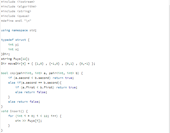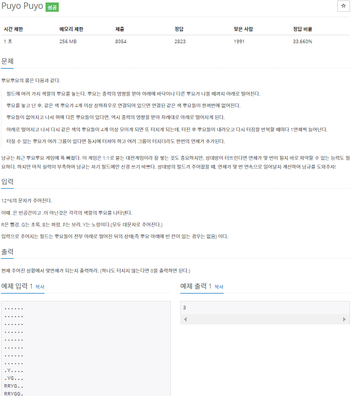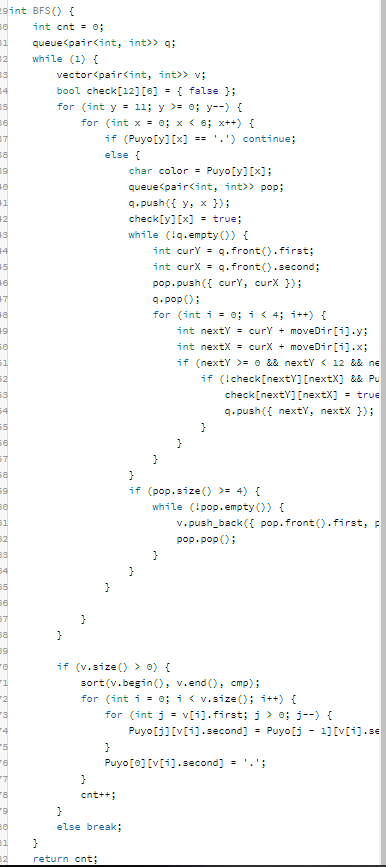 BFS 알고리즘을 사용하는 문제의 변형이다. 문제 해결 접근 방법은 다음과 같다. 문자열 행렬 탐색 - 색깔 요소 검출시 상하좌우 탐색 - 탐색된 좌표는 큐에 저장 - 큐에 저장된 좌표쌍의 수가 4 이상이라면, 블록이 파괴된다. - 해당 연산을 더 이상 블록이 터지지 않을 때 까지 실행한다.