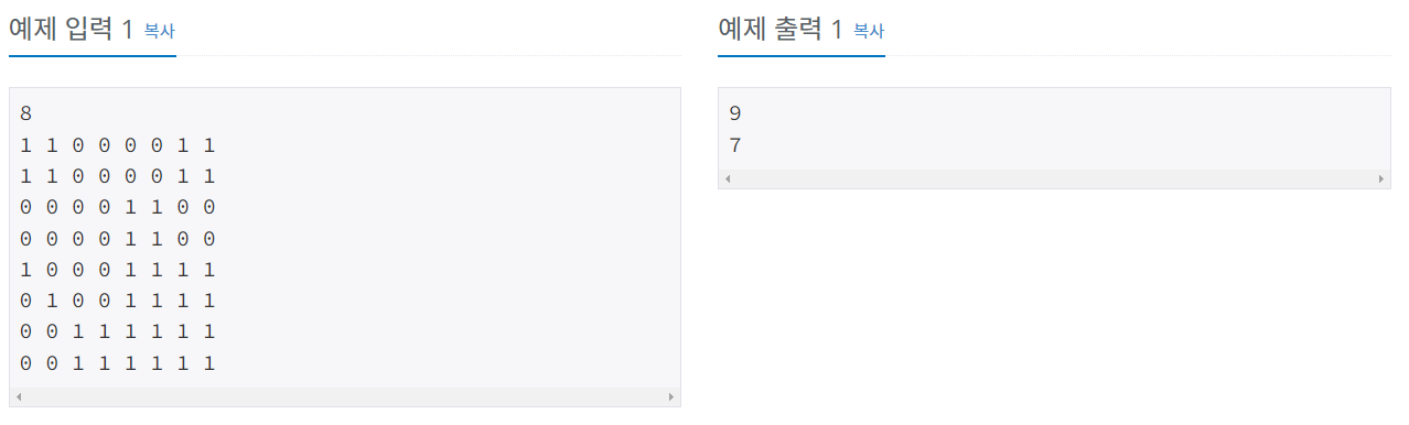 첫째 줄에는 전체 종이의 한 변의 길이 N이 주어져 있다. N은 2, 4, 8, 16, 32, 64, 128 중 하나이다. 색종이의 각 가로줄의 정사각형칸들의 색이 윗줄부터 차례로 둘째 줄부터 마지막 줄까지 주어진다.