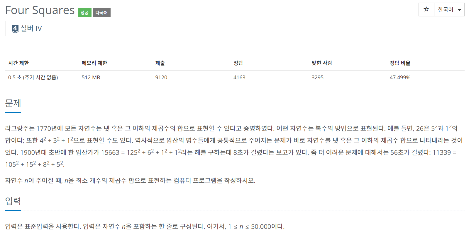 라그랑주는 1770년에 모든 자연수는 넷 혹은 그 이하의 제곱수의 합으로 표현할 수 있다고 증명하였다. 어떤 자연수는 복수의 방법으로 표현된다. 예를 들면, 26은 52과 12의 합이다; 또한 42 + 32 + 1