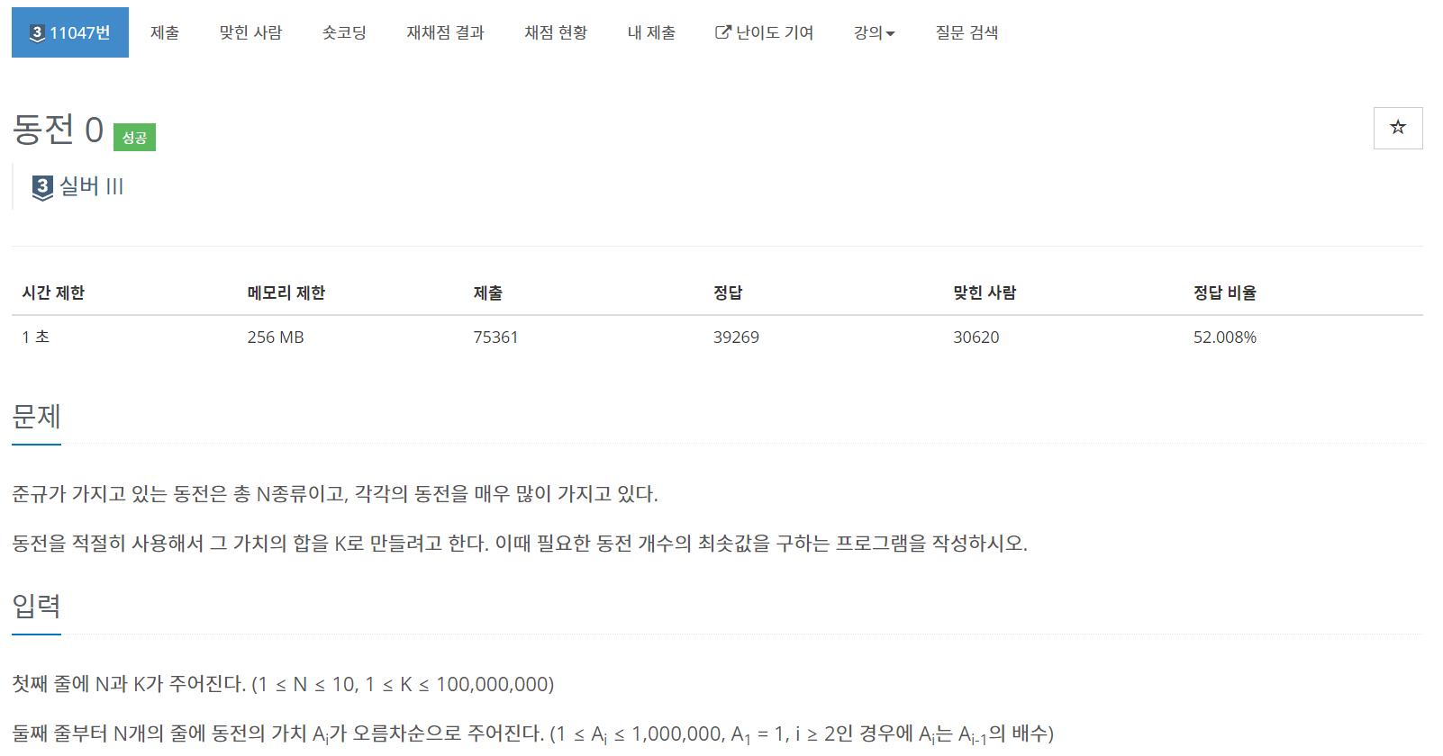 11047번: 동전 0