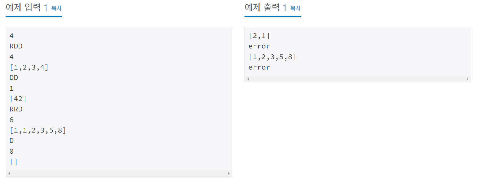 각 테스트 케이스에 대해서, 입력으로 주어진 정수 배열에 함수를 수행한 결과를 출력한다. 만약, 에러가 발생한 경우에는 error를 출력한다.
