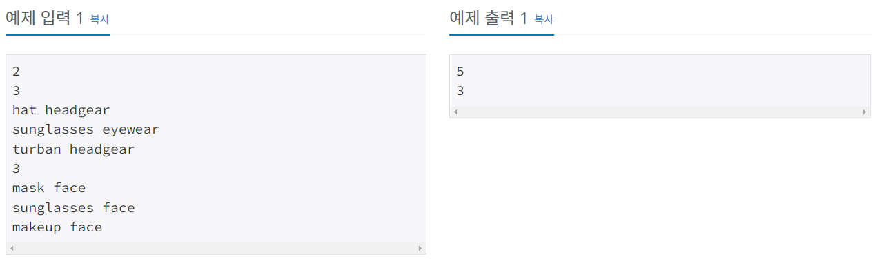 첫 번째 테스트 케이스는 headgear에 해당하는 의상이 hat, turban이며 eyewear에 해당하는 의상이 sunglasses이므로 (hat), (turban), (sunglasses), (hat,sunglasses), (turban,sunglasses)로 총 5가지 이다.