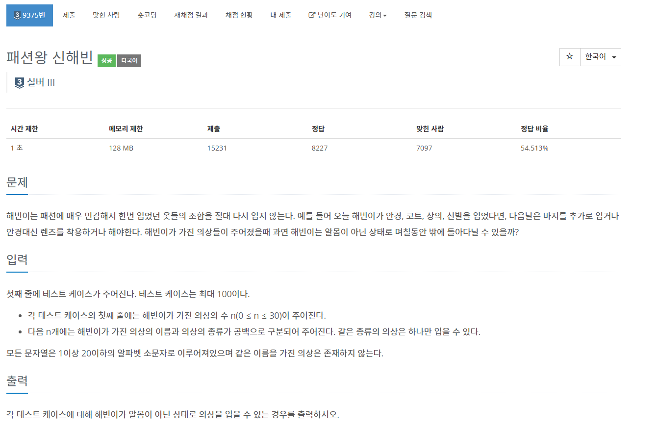 9375번: 패션왕 신해빈