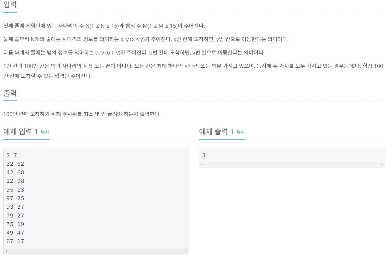 첫째 줄에 게임판에 있는 사다리의 수 N(1 ≤ N ≤ 15)과 뱀의 수 M(1 ≤ M ≤ 15)이 주어진다. 둘째 줄부터 N개의 줄에는 사다리의 정보를 의미하는 x, y (x < y)가 주어진다. x번 칸에 도착하면, y번 칸으