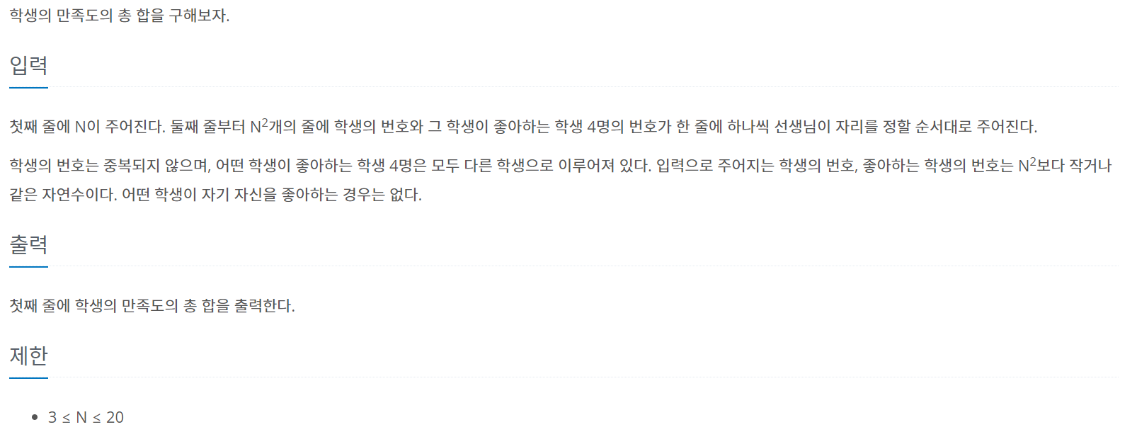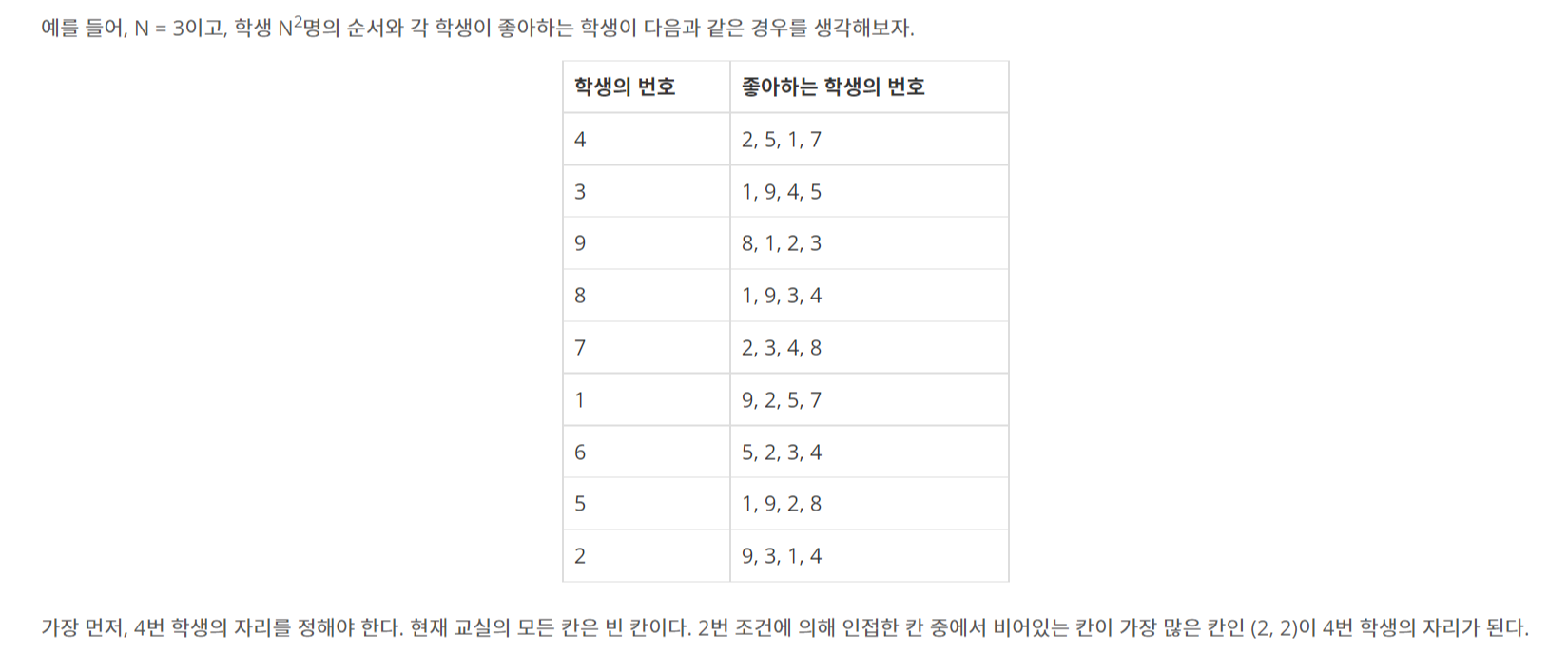상어 초등학교에는 교실이 하나 있고, 교실은 N×N 크기의 격자로 나타낼 수 있다. 학교에 다니는 학생의 수는 N2명이다. 오늘은 모든 학생의 자리를 정하는 날이다. 학생은 1번부터 N2번까지 번호