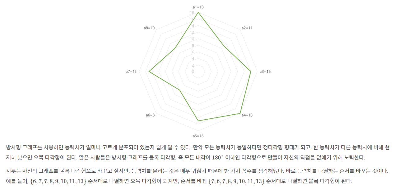 게임 캐릭터의 능력치를 한 눈에 보기 좋게 나타내는 방법으로 방사형 그래프가 있다. 캐릭터는 8개의 능력치를 갖고 있고 각 능력치를 $a_1, a_2, \cdots, a_8$이라고 하면, 그래프는 팔각형 형태이고