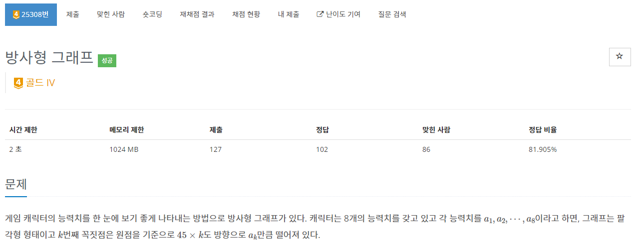 점의 좌표는 방사형 그래프를 원점으로 두고, 각 꼭지점은 pi/4 이므로 이를 이용하여 각 좌표를 계산할 수 있다.
