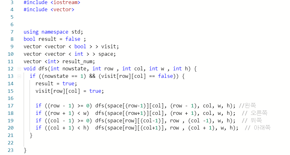 DFS를 돌면서 상하좌우의 조건을 걸어서 탐색하게 하였다. 즉 배열 전체를 돌면서, 탐색안한곳을 시작하면