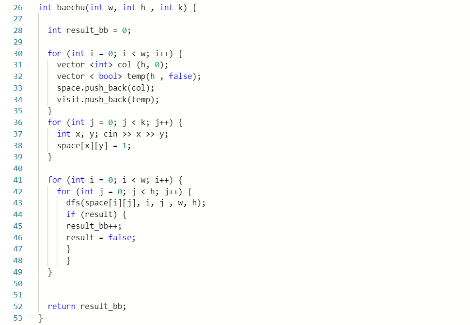 배추 흰지렁이 개수를 증가시키고 그 지렁이가 갈수있는 모든 경로의 Visit 배열을 True바꾸어주었다.