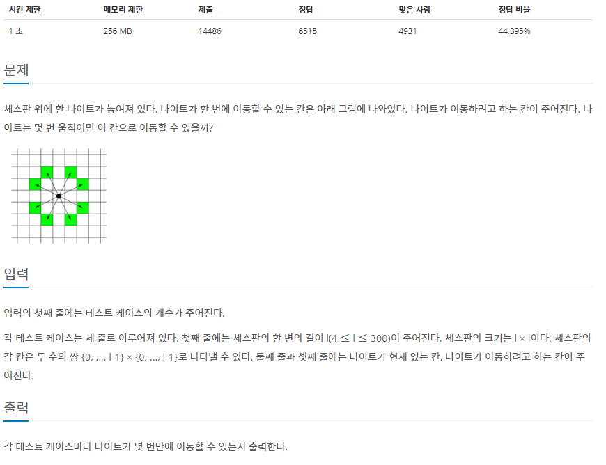 문제 체스판 위에 한 나이트가 놓여져 있다. 나이트가 한 번에 이동할 수 있는 칸은 아래 그림에 나와있다. 나이트가 이동하려고 하는 칸이 주어진다. 나이트는 몇 번 움직이면 이 칸으로 이동할 수 있을까? 입력 입력의 첫째 줄에는 테스트 케이스의 개수가 주어진다. 각 테스트 케이스는 세 줄로 이루어져 있다. 첫째 줄에는 체스판의 한 변의 길이 l(4 ≤ l ≤ 300)이 주어진다. 체스판의 크기는 l × l이다. 체스판의 각 칸은 두 수의 쌍 {0, ...