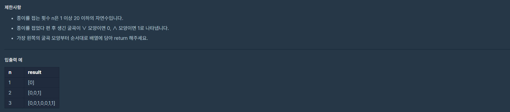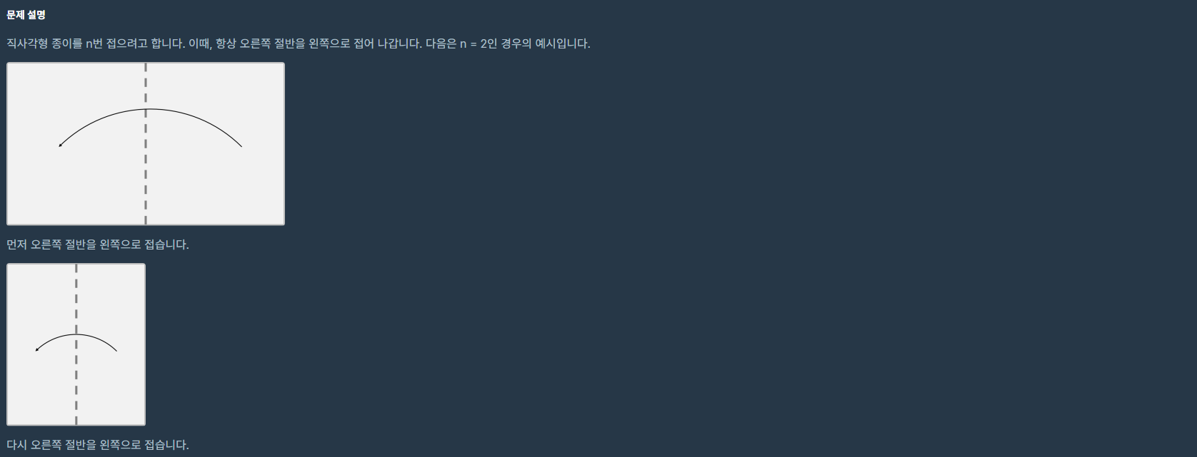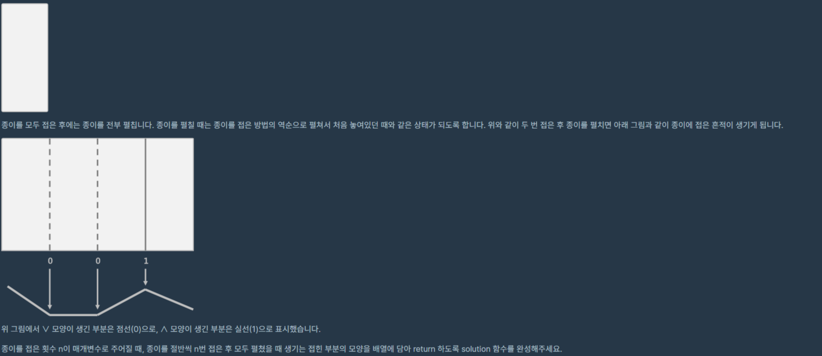 종이를 반씩 접으면서 튀어나온 부분은 1 들어간 부분은 0 으로한 배열을 리턴하는 문제이다.