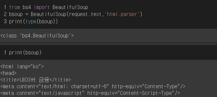 하지만 단순한 string에서 우리가 원하는 정보를 찾기 어렵기 때문에 BeautifulSoup을 이용한다.
