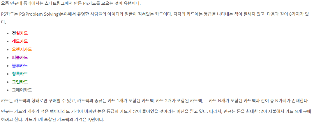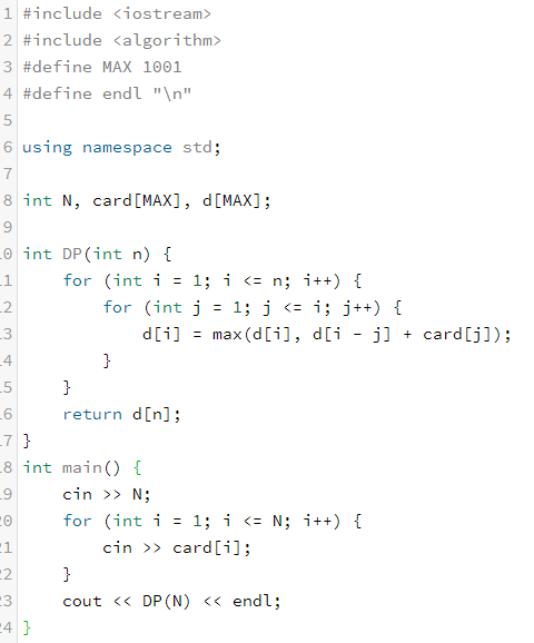 주어진 인덱스는 카드의 장수이고, 인덱스로 표기되는 팩에 따라 카드의 코스트를 입력 받는다. 원하는 카드의 개수 N 을 입력 받아 해당 카드의 개수를 구매할 때 금액의 최댓값을 출력하는 문제이다. 문제 해결에 대한 접근으로 2중 for 문을 사용하여, 원하는 카드를 구하기 까지 최대값을 갱신하도록 알고리즘을 작성한다.