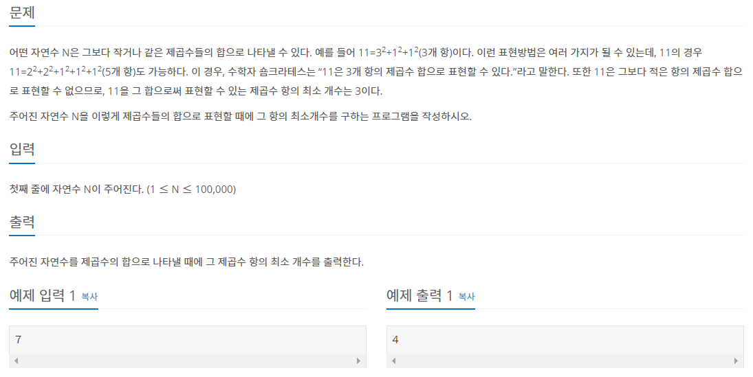 주어진 수를 제곱수로 나타낼 수 있는 최소의 항을 출력하는 문제이다. 주어진 수는, 주어진 수보다 작은 최대 제곱수의 경우 + 1의 규칙을 가지고 있다. 따라서, 해당 규칙을 만족하는 경우의 수가 현재 인덱스에 저장되어 있는 수보다 작다면, 갱신된다.