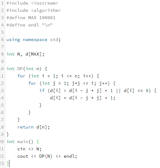 주어진 수를 제곱수로 나타낼 수 있는 최소의 항을 출력하는 문제이다. 주어진 수는, 주어진 수보다 작은 최대 제곱수의 경우 + 1의 규칙을 가지고 있다. 따라서, 해당 규칙을 만족하는 경우의 수가 현재 인덱스에 저장되어 있는 수보다 작다면, 갱신된다.
