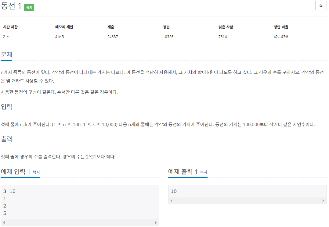 BOJ - 2293) 동전 1 본문