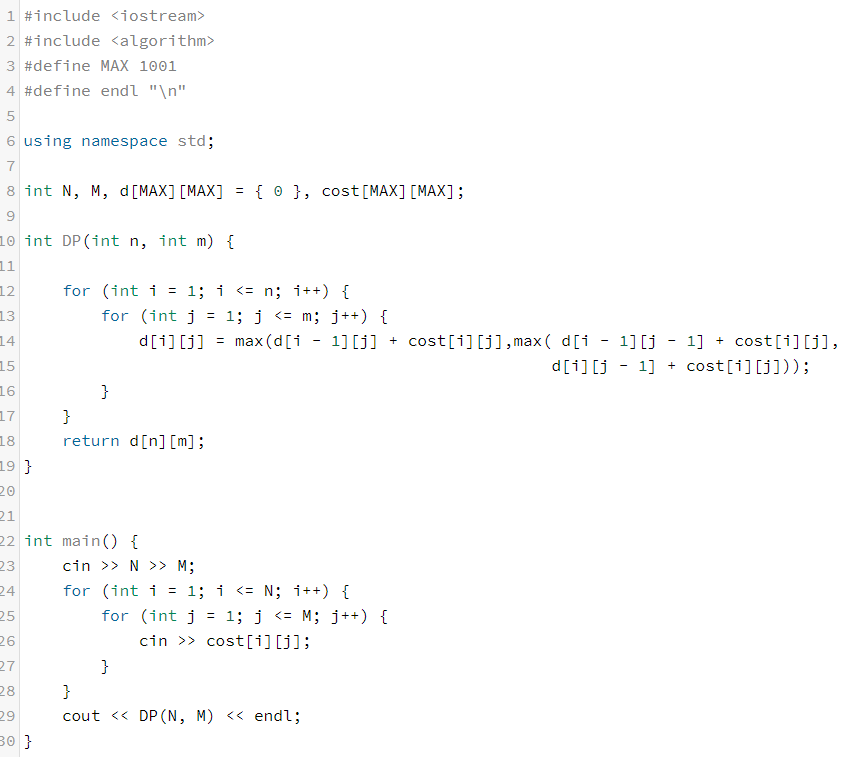 준규는 1,1 에서 출발하여 주어진 N,M 까지 이동하며 이동하는 칸의 사탕을 가져간다. N,M 칸에 도달할 때 준규가 가질수 있는 최대의 사탕 개수를 도출하는 문제이다. 해당 문제의 접근법은 다음과 같다.