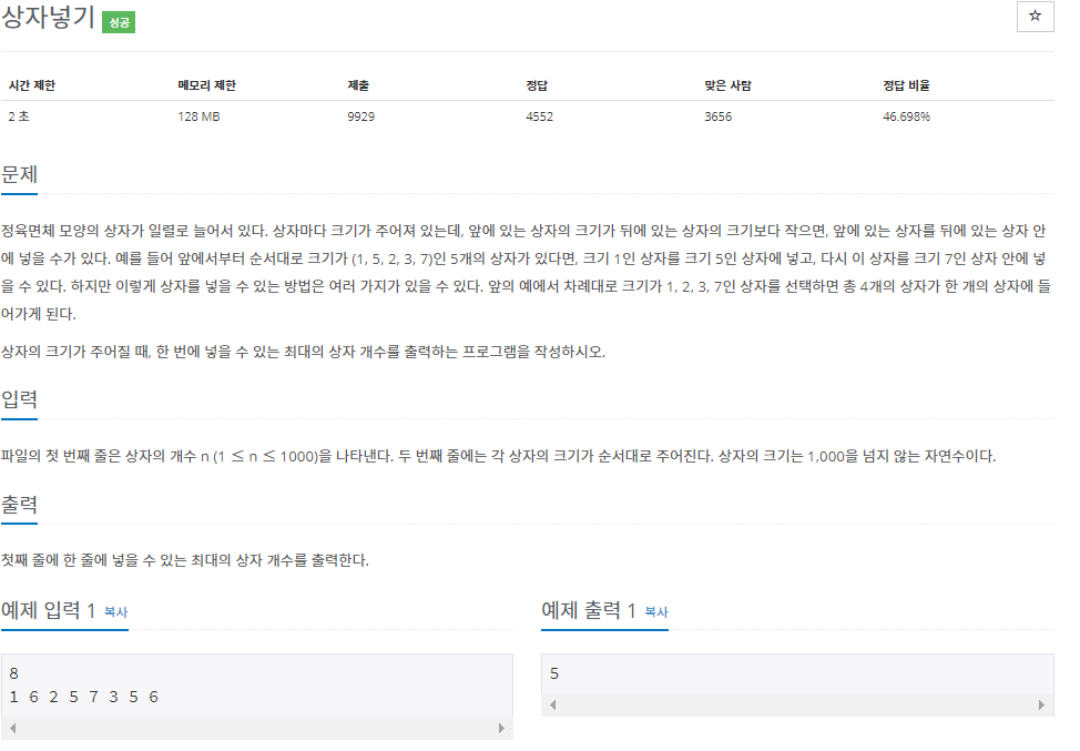 주어진 상자의 크기가 위와 같이 각각 1, 5, 2, 3, 7 의 경우 1, 2, 3, 7 의 크기 차례로 상자에 넣을 수 있다. 예제의 경우 8개의 상자 크기가 주어질 때 1, 2, 3, 5, 6 의 순으로 상자를 넣는 것이 가장 많은 상자의 개수를 출력하게 된다. 따라서, 해당 문제는 가장 긴 부분 수열과 같은 방법으로 해결하는 문제이다.