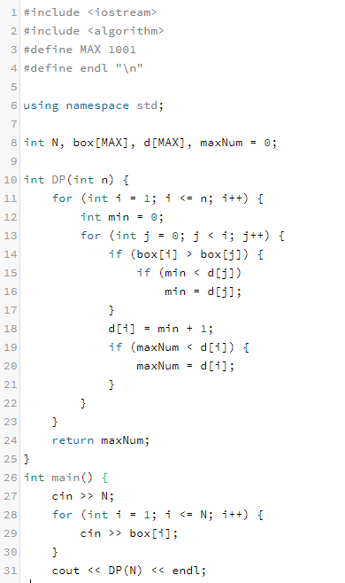 가장 긴 부분 수열을 구하는 문제와 같이, 2중 for 문을 활용하여 인덱스 마다 상자를 넣을 수 있는 최대 개수를 갱신하는 DP 알고리즘을 통하여 문제 해결이 가능하다.