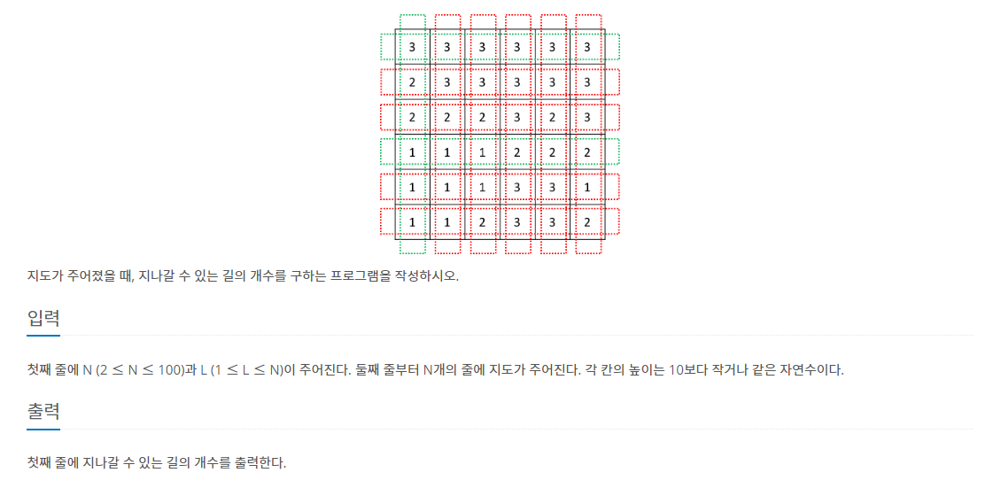 첫째 줄에 N (2 ≤ N ≤ 100)과 L (1 ≤ L ≤ N)이 주어진다. 둘째 줄부터 N개의 줄에 지도가 주어진다. 각 칸의 높이는 10보다 작거나 같은 자연수이다.